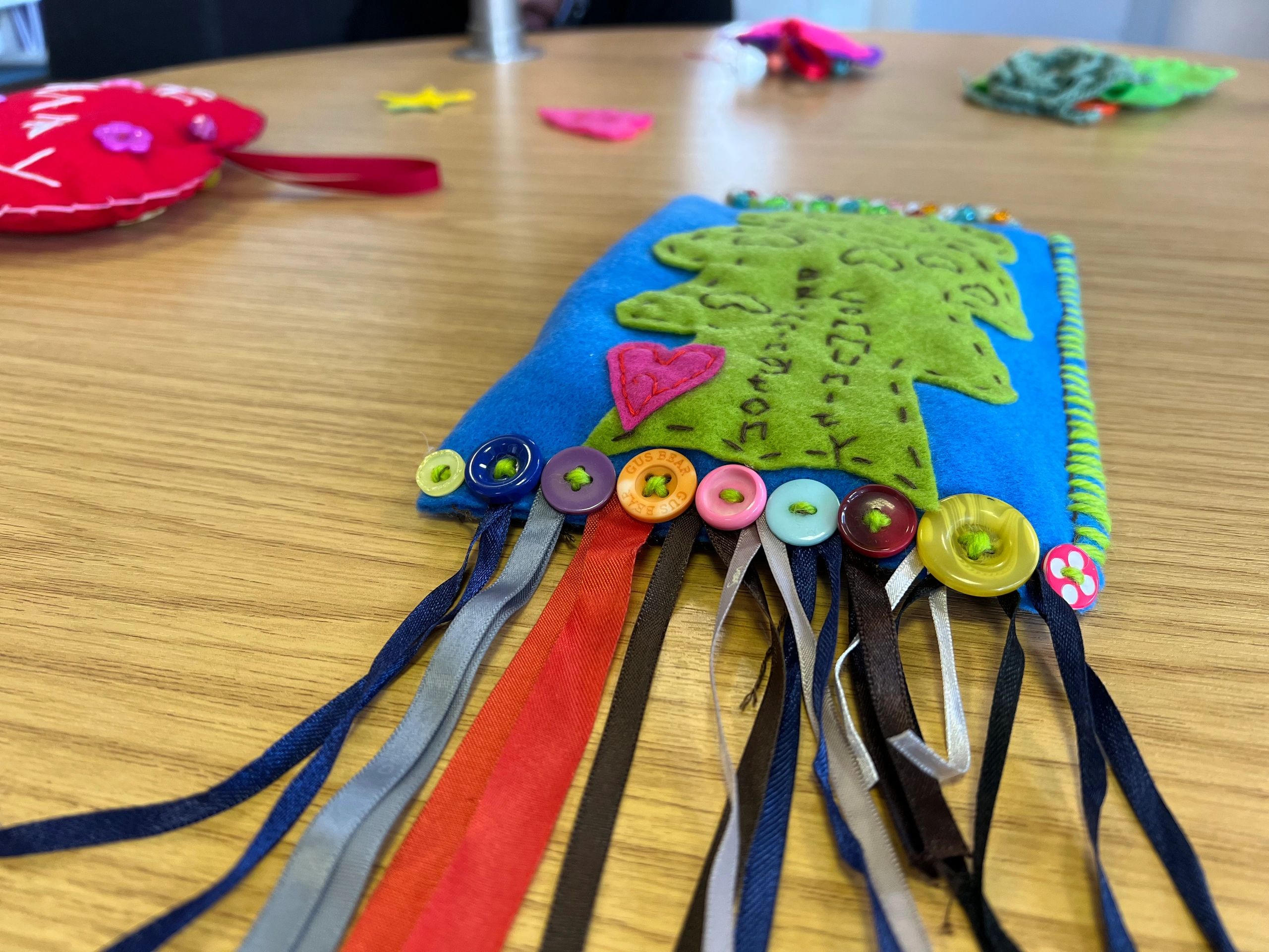 Leading a textile workshop with a group of older people from Brinnington, Stockport. Commissioned by Castlefield Gallery, Manchester, funded by GMCA. 2023.
